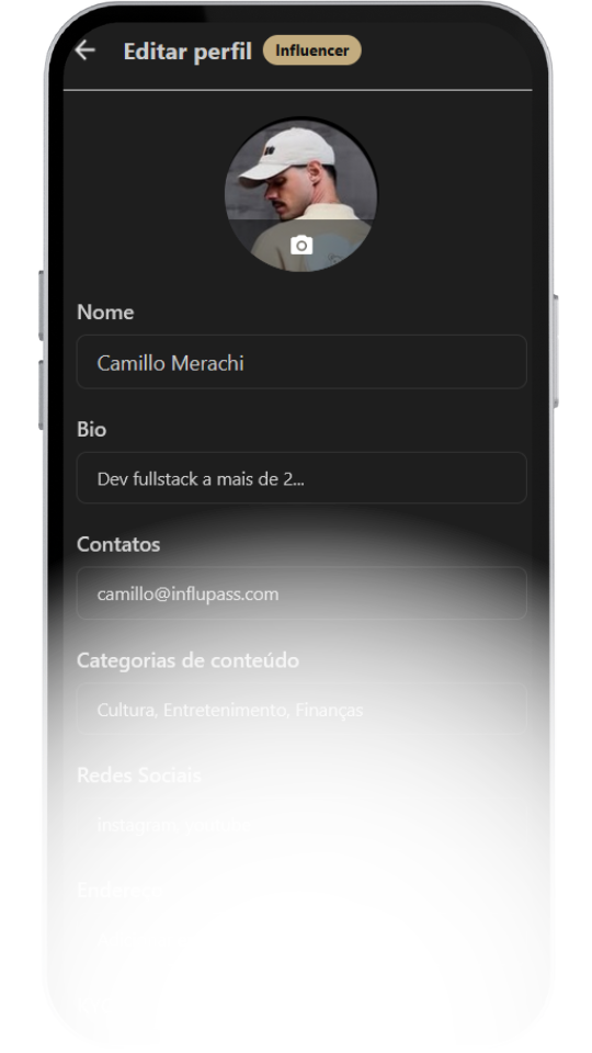 Preencha a bio, nicho, cidade, métricas e portfólio.